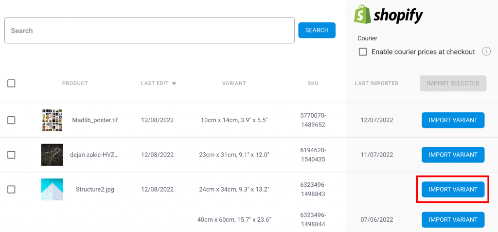 (1) Import Variant. This option will import a single variant of a product. To do this click the blue ‘import variant’ button next to the variant you wish to import.